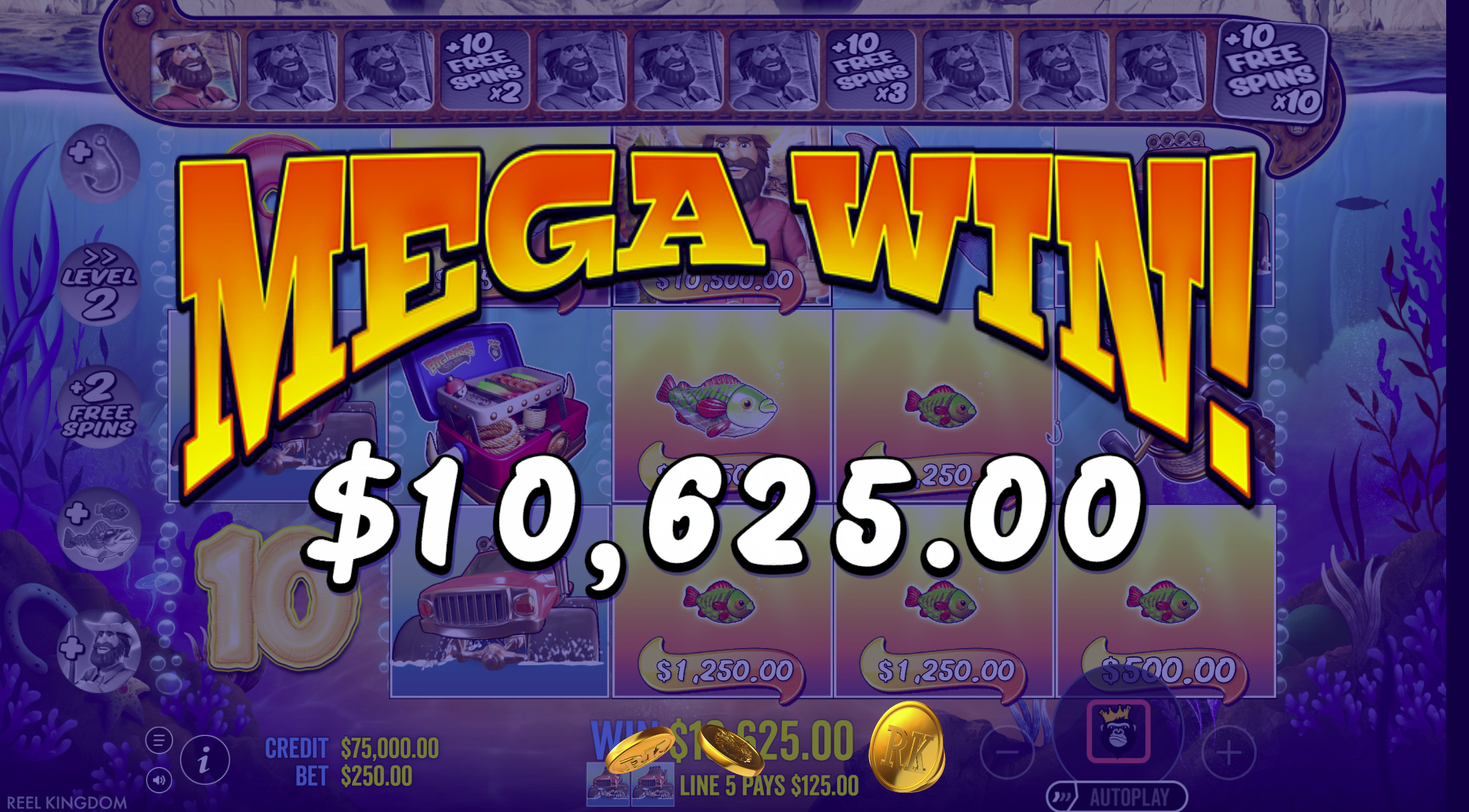 • Money Symbols (Fish with cash values): These can appear during both base game and free spins. In the bonus round, if a fisherman wild lands, it collects visible money values for cash prizes. :contentReference[oaicite:11]{index=11}